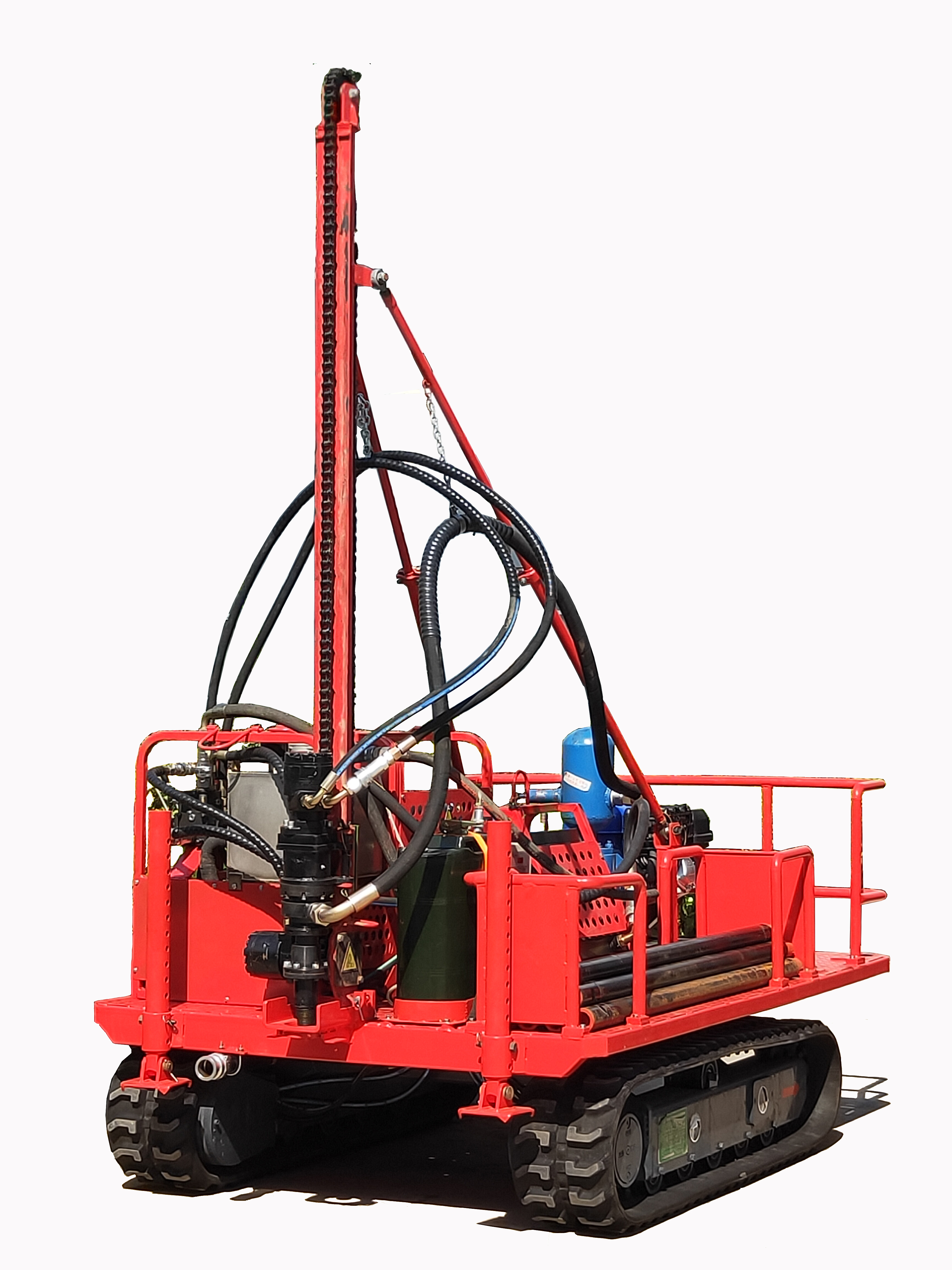 1、 鉆機(jī)底盤采用工程橡膠履帶底盤,行走驅(qū)動(dòng)共用鉆機(jī)液壓動(dòng)力系統(tǒng);行走控制采用遙控比例柔性控制,確保操作者的安全性;底盤帶自動(dòng)剎車系統(tǒng);